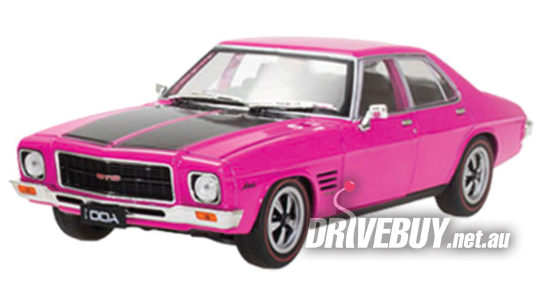 Holden HQ Monaro four-door sedan in dark pink with black interior and stripes, factory mags and redline tyres.