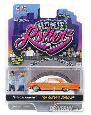 Greenlight presents the original Homie Rollerz, classic lowriders with two collectible figures. 1/24 scale, presented on a themed window card.