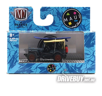 Surfin WW2 style! Willys jeep in dark blue with tan canopy and removable surfboard.