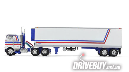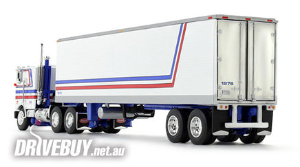 This authentic Peterbilt® 352 COE 86" Sleeper diecast metal replica model comes paired with a 40' Vintage Trailer with Reefer and features a tilting cab that reveals authentic engine detail, poseable front wheels, accurate detailed interior, pivoting fifth-wheel for trailer attachment, functioning landing gear, opening rear doors, and a detailed undercarriage. Includes certificate and custom packaging. This quality replica is decorated with a red, white, and blue paint scheme.