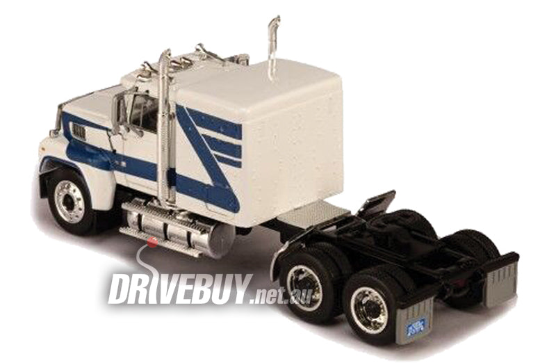 1978 Ford LTL9000 with sleeper cab, in white with blue graphics.