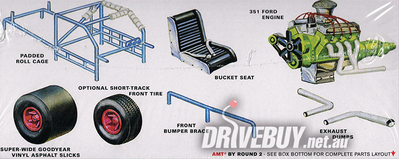 This kit has some great features including a padded roll cage, front bumper braces, bucket seats, exhaust dumps, a 351 Ford engine, pad-printed Goodyear super wide slicks, and an optional short track front tire. It also includes a set of updated colorful waterslide decals and Retro Deluxe™ AMT reproduction packaging.