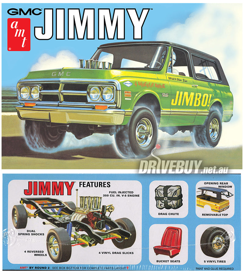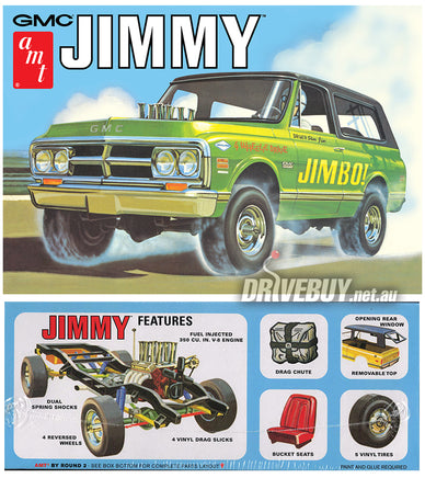 The Jimmy is an iconic ride with off-road style! Fully paintable, it features an expanded sheet of water-slide decals loaded with colorful options. Build it 1 of 2 ways: stock or drag. Features include stock and drag engine parts, removable roof with opening rear window, pad printed M&H Racemaster drag slicks, stock and drag wheels, and more. Wrapped up nicely in vintage-styled packaging!