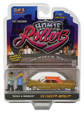 Greenlight presents the original Homie Rollerz, classic lowriders with two collectible figures. 1/24 scale, presented on a themed window card.