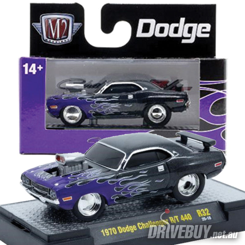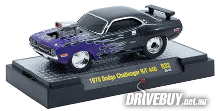 1970 Dodge Challenger R/T 440 1/64 - M2 Diecast - Black with Purple Flames