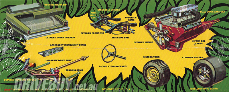 Fully paintable, it features an expanded decal sheet of colorful water-slide decals with vintage-style options. Build it one of three ways: stock, custom or racing—featuring engine and exhaust options, multiple interiors, optional wheels, whitewall tires, drags slicks, opening trunk, custom grille, headlights, taillights and more!