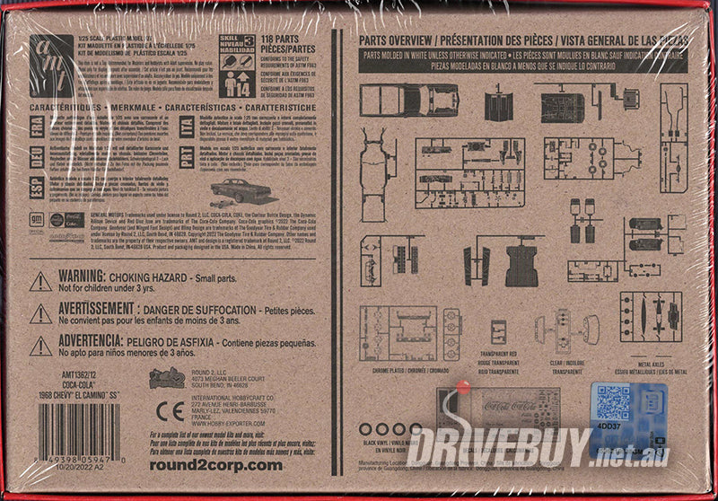 BIG ON DETAILS: A kit rich in history! Fully paintable, it features an ALL-NEW sheet of colorful Coca-Cola water-slide decals with many classic options. Also included: detailed Chevy SS396 V8 engine, 2-in-1 pad printed tires offering red line pinstripes on one side and Goodyear lettering on the other, bucket seats, optional Torq-thrust mags or rally wheels, BONUS soap box derby racing car, BONUS display base and more! All wrapped up in highly collectible and totally NEW Coca-Cola packaging!