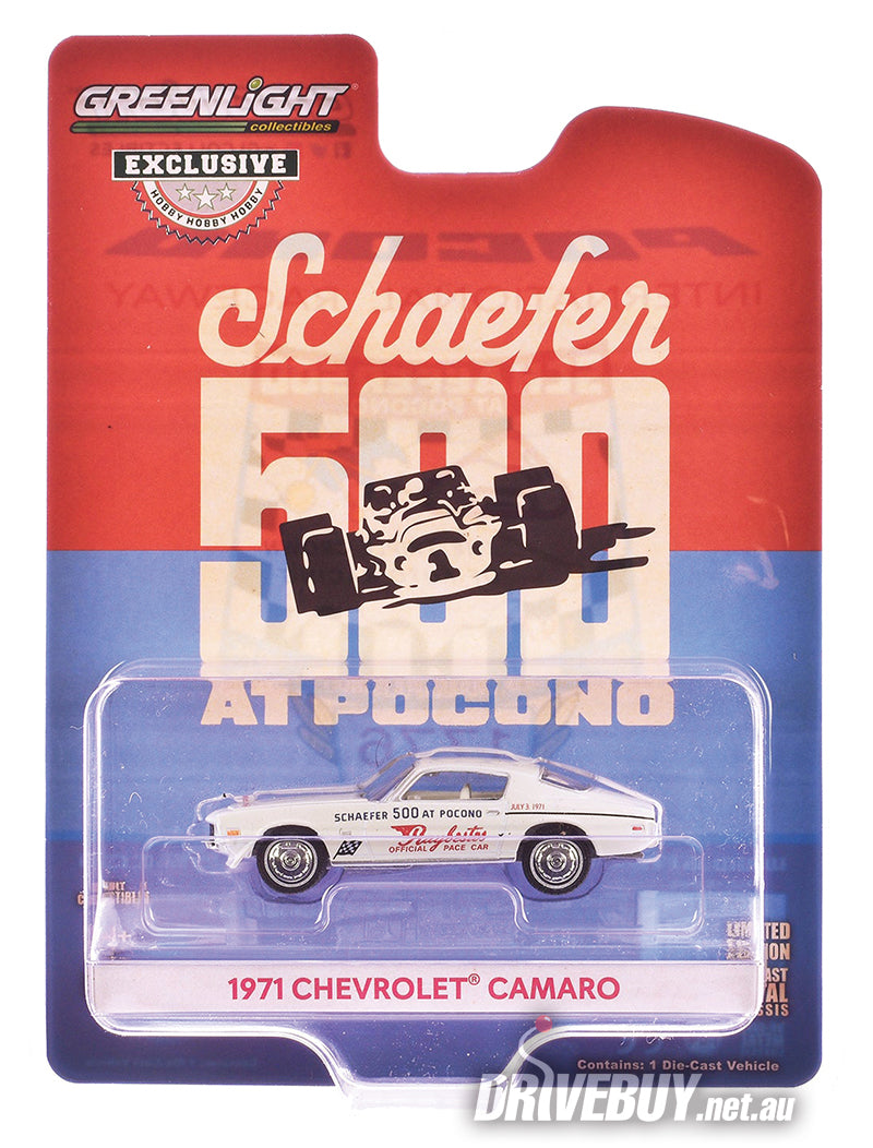 Celebrate the Schaefer 500 at Pocono International raceway with this 1971 Chevrolet Camaro pace car in white with Raybestos signage.