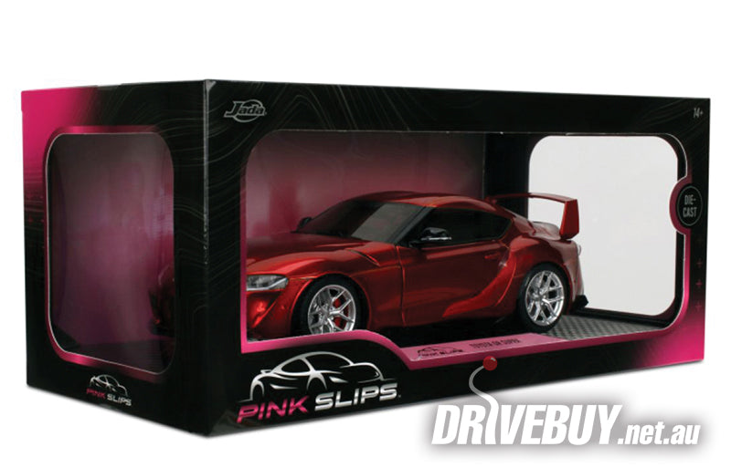 Toyota Supra Mk5 in metallic red with black interior. Includes base and 3D frame display.