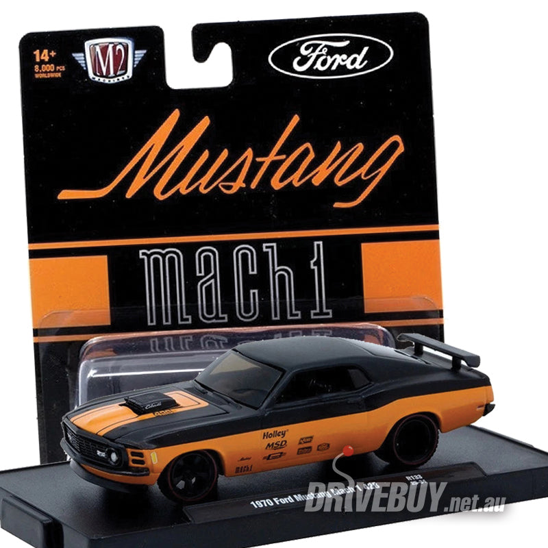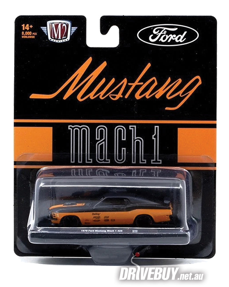1970 Ford Mustang Mach 1 428 in orange and black with race decals and redline tyres.