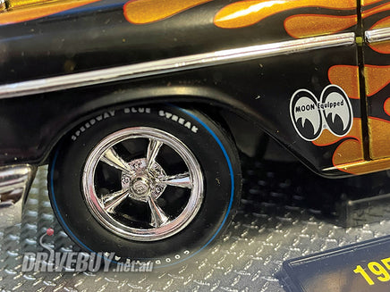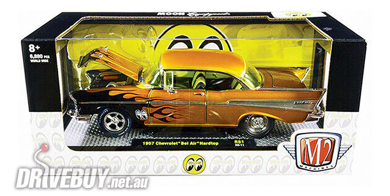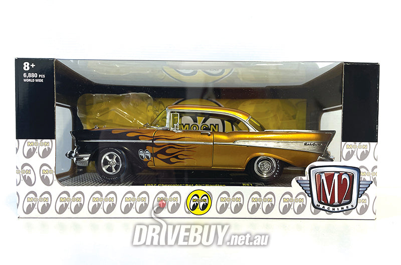 Presneted in stunning gold with traditional flames in black outlined in red, this 1957 Chevy Bel Air coupe is truly gold class! Mooneyes decals and licence plate add an extra touch of nostalgia to this striking diecast model from M2 Machines.