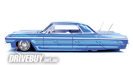 This Lowrider 1964 Chevrolet Impala SS Coupe is slammed over chrome wires, finished in metallic blue with extensive aqua and white striping and graphics, and chrome highlights.