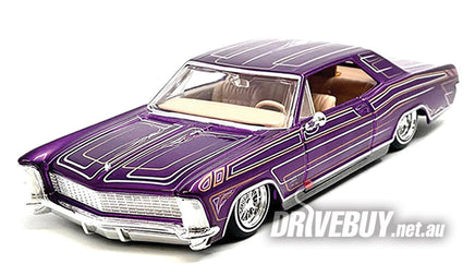 Lowrider 1965 Buick Riviera slammed over wire wheels, finished in purple with pinstriping and graphics, and chrome highlights.