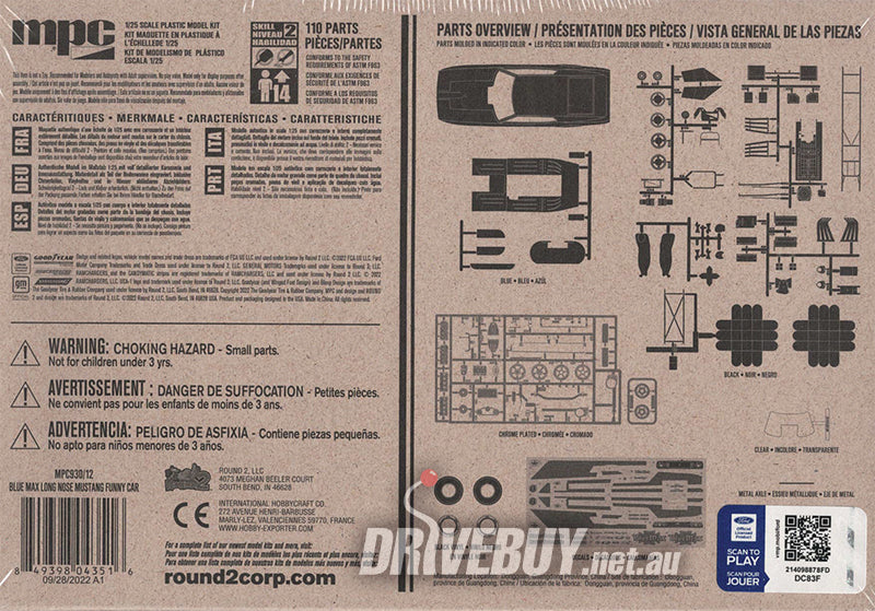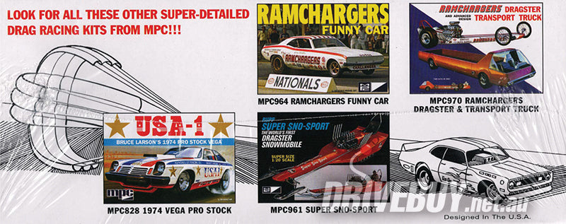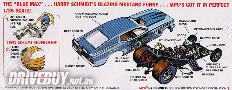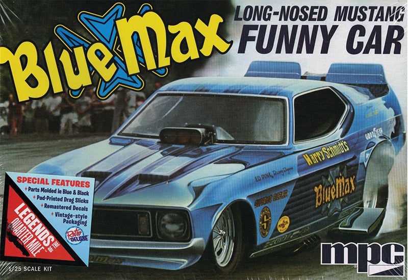 The Blue Max Long Nose Mustang Funny Car kit features details like pad-printed drag slicks, a one-piece tubular frame, a detailed engine, and giant open chutes. The kit also includes a remastered & expanded decal sheet, and Retro Deluxe™ MPC packaging.